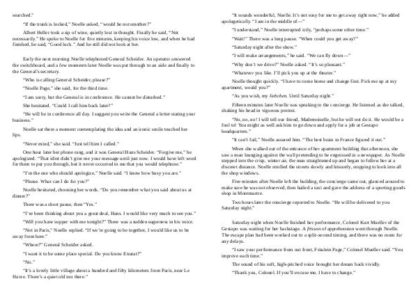 Saturday night when Noelle finished her performance, Colonel Kurt Mueller of the Gestapo was waiting for her backstage. A frisson of apprehension went through Noelle. The escape plan had been worked out to a split-second timing, and there was no room for any delays.