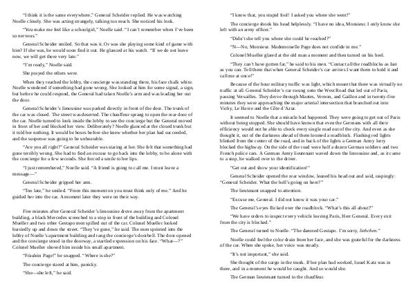 Five minutes after General Scheider’ s limousine drove away from the apartment building, a black Mercedes screeched to a stop in front of the building and Colonel Mueller and two other Gestapo men spilled out of the car. Colonel Mueller looked hurriedly up and down the street.“ They’ ve gone,” he said. The men sprinted into the lobby of Noelle’ s apartment building and rang the concierge’ s doorbell. The door opened and the concierge stood in the doorway, a startled expression on his face.“ What—?” Colonel Mueller shoved him inside his small apartment.