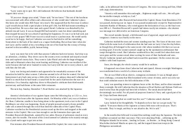 America’ s declaration of war against Japan came the following day at 1:32 P. M., less than twenty-four hours after the Japanese attack. On Monday while Larry was at Andrews Air Base, Catherine, unable to bear being alone in the apartment, took a taxi to the Capitol Building to see what was happening. Knots of people pressed around a dozen portable radio sets scattered through the crowd that lined the sidewalks of the Capitol Plaza. Catherine watched as the Presidential caravan raced up the drive and stopped at the south entrance to the Capitol. She was close enough to see the limousine door open and President Roosevelt disembark, assisted by two aides. Dozens of policemen stood at every corner, alert for trouble. The mood of the crowd seemed to Catherine to be mainly outrage, like a lynch mob eager to get into action.