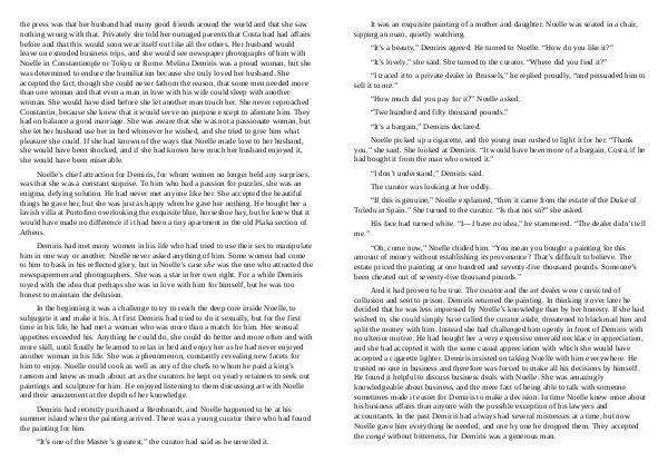 In the beginning it was a challenge to try to reach the deep core inside Noelle, to subjugate it and make it his. At first Demiris had tried to do it sexually, but for the first time in his life, he had met a woman who was more than a match for him. Her sensual appetites exceeded his. Anything he could do, she could do better and more often and with more skill, until finally he learned to relax in bed and enjoy her as he had never enjoyed another woman in his life. She was a phenomenon, constantly revealing new facets for him to enjoy. Noelle could cook as well as any of the chefs to whom he paid a king’ s ransom and knew as much about art as the curators he kept on yearly retainers to seek out paintings and sculpture for him. He enjoyed listening to them discussing art with Noelle and their amazement at the depth of her knowledge.