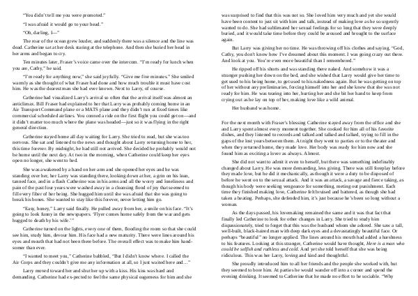 But Larry was giving her no time. He was throwing off his clothes and saying,“ God, Cathy, you don’ t know how I’ ve dreamed about this moment. I was going crazy out there. And look at you. You’ re even more beautiful than I remembered.”