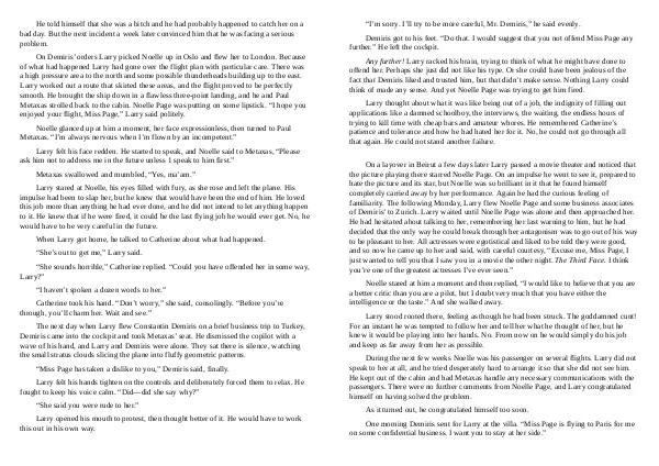 One morning Demiris sent for Larry at the villa.“ Miss Page is flying to Paris for me on some confidential business. I want you to stay at her side.”