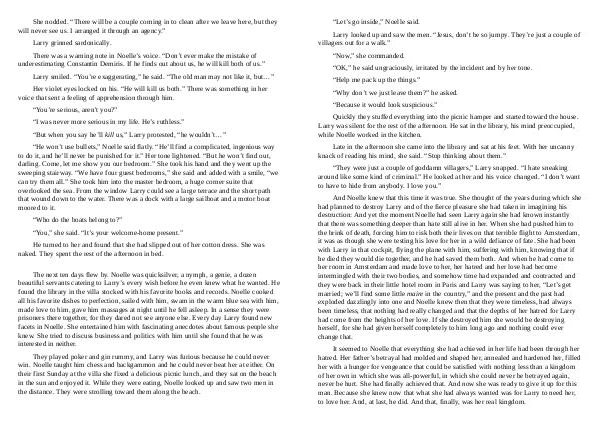 “ He won’ t use bullets,” Noelle said flatly.“ He’ ll find a complicated, ingenious way to do it, and he’ ll never be punished for it.” Her tone lightened.“ But he won’ t find out, darling. Come, let me show you our bedroom.” She took his hand and they went up the sweeping stairway.“ We have four guest bedrooms,” she said and added with a smile,“ we can try them all.” She took him into the master bedroom, a huge corner suite that overlooked the sea. From the window Larry could see a large terrace and the short path that wound down to the water. There was a dock with a large sailboat and a motor boat moored to it.