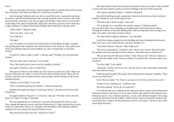As Catherine and Larry walked out, the huge gate slowly swung closed behind them. Catherine turned to look back at it. It was like a prison. But somehow this seemed worse. Perhaps because it was a voluntary penance, a waste, and Catherine thought of the young women she had seen from the window, walled up here, shut away from the world for the rest of their lives, living in the deep permanent silence of the grave. She knew she would never forget this place.