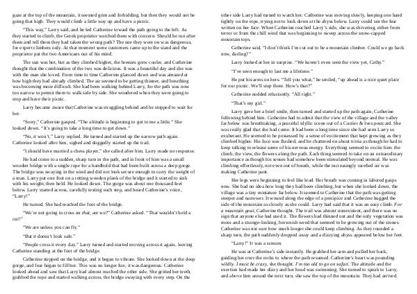 other side Larry had turned to watch her. Catherine was moving slowly, keeping one hand tightly on the rope, trying not to look down at the abyss below. Larry could see the fear written on her face. When Catherine reached Larry’ s side, she was shivering, either from terror or from the chill wind that was beginning to sweep across the snow-capped mountain tops.
