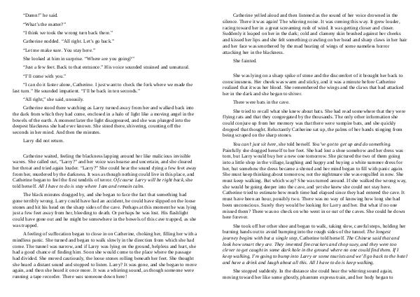 You can’ t just sit here, she told herself. You’ ve got to get up and do something. Painfully she dragged herself to her feet. She had lost a shoe somehow and her dress was torn, but Larry would buy her a new one tomorrow. She pictured the two of them going into a little shop in the village, laughing and happy and buying a white summer dress for her, but somehow the dress became a shroud and her mind began to fill with panic again. She must keep thinking about tomorrow, not the nightmare she was engulfed in now. She must keep walking. But which way? She was turned around. If she walked the wrong way, she would be going deeper into the cave, and yet she knew she could not stay here. Catherine tried to estimate how much time had elapsed since they had entered the cave. It must have been an hour, possibly two. There was no way of knowing how long she had been unconscious. Surely they would be looking for Larry and her. But what if no one missed them? There was no check on who went in or out of the caves. She could be down here forever.