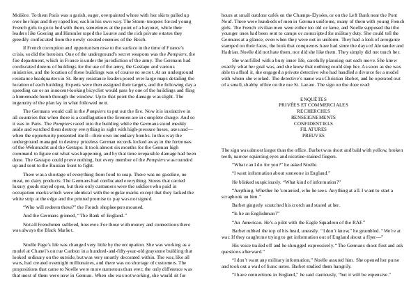 Noelle Page’ s life was changed very little by the occupation. She was working as a model at Chanel’ s on rue Canbon in a hundred-and-fifty-year-old graystone building that looked ordinary on the outside, but was very smartly decorated within. The war, like all wars, had created overnight millionaires, and there was no shortage of customers. The propositions that came to Noelle were more numerous than ever; the only difference was that most of them were now in German. When she was not working, she would sit for