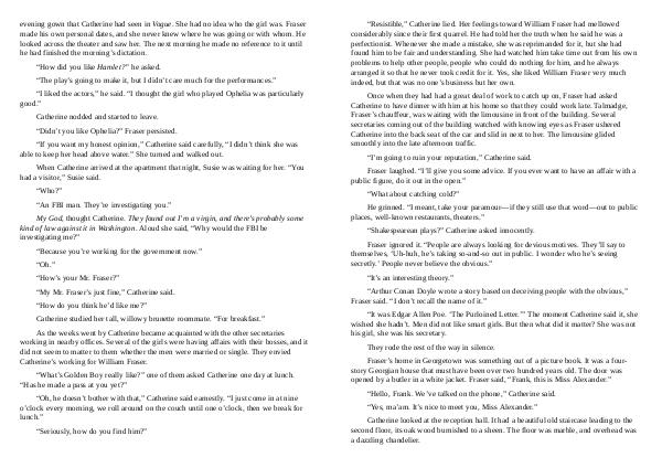 Once when they had had a great deal of work to catch up on, Fraser had asked Catherine to have dinner with him at his home so that they could work late. Talmadge, Fraser’ s chauffeur, was waiting with the limousine in front of the building. Several secretaries coming out of the building watched with knowing eyes as Fraser ushered Catherine into the back seat of the car and slid in next to her. The limousine glided smoothly into the late afternoon traffic.