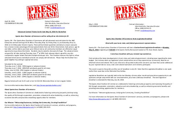 Sparta, WI – The Sparta Area Chamber of Commerce will sell advanced carnival tickets for the A & P Enterprise carnival starting at 8:30 AM on Thursday, May 10, Friday, May 11, and Saturday, May 12, 2018 at 111 Milwaukee Street in Sparta. There will be limited quantities sold daily to ensure everyone has a chance to take advantage of these special tickets that cost $ 5 for three tickets. Each person, age 16 and older, will be able to purchase up to $ 50 per visit so all community members are offered an equal opportunity to purchase the tickets. Students may be asked to show proof of age. The advance tickets are good for all rides starting Thursday, June 7 th at 5PM. Each advance ticket is good for any ride compared to regular tickets that take multiple tickets per ride. The Chamber reserves the right to refuse advanced ticket sales to individuals who do not comply with directions. Please help the Chamber be a good neighbor by parking in appropriate areas.