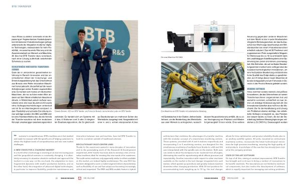 Hinzu kommen weitere kleinere und größere Innovationen, die das Unternehmen an seinen Transfermaschinen vorgenommen hat und weiterhin vornimmt, schließlich ist man immer um ständige Verbesserung bemüht. Die Innovationen betreffen aber nicht nur die Mechanik: Die für die Handhabung und Lösung von Problemen ebenso wichtige, neu entwickelte Software ermöglicht es, das Problem der langen Späne zu lösen, die bei der Bearbeitung bleifreier Messinglegierungen entstehen( z. B. CW511L). Diesbezüglich wurden architecture that combines the advantages of a transfer machine with the modular concept of a stand-alone machining centres. These systems, provided with 4 and 6 stations respectively and incorporating 3 or 5 machining centres, are designed for the simultaneous machining of multiple faces thanks to a 4th and 5th axis interpolated with the spindle axis on the station. Both axes can rotate to allow the workpiece to be machined from all angles, eliminating the need for repositioning which affects precision and repeatability. Another innovation with respect to other machines available on the market is the tool changer integrated into each station, which speeds up operations and greatly reduces machine downtime when changing production. With 30 tool positions for accommodating tools weighing up to 10 kg, the tool changer allows for time optimisation and greater reliability thanks also to an ancillary satellite system. All units, mounted on vertical-axis machining centres, incorporate the latest technological innovations for high precision machining, ensuring the high quality of end products. A prototype of the new line has already been tested at the company premises.
