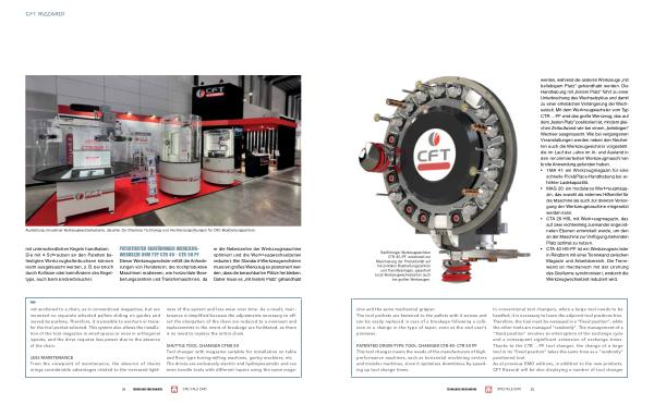CTR 40 – PF, entwickelt zur Maximierung der Produktivität auf horizontalen Bearbeitungszentren und Transferanlagen, garantiert kurze Werkzeugwechselzeiten auch bei großen Werkzeugen. werden, während die anderen Werkzeuge „ mit beliebigem Platz” gehandhabt werden. Die Handhabung mit „ festem Platz“ führt zu einer Unterbrechung des Wechselzyklus und damit zu einer erheblichen Verlängerung der Wechselzeit. Mit dem Werkzeugwechsler vom Typ CTR … PF wird das große Werkzeug, das auf dem „ festen Platz” positioniert ist, mit dem gleichen Zeitaufwand wie bei einem „ beliebigen” Wechsel ausgetauscht. Wie bei vergangenen Veranstaltungen werden neben den Neuheiten auch die Werkzeugwechsler vorgestellt, die im Lauf der Jahre im In- und Ausland in den renommiertesten Werkzeugmaschinen breite Anwendung gefunden haben.