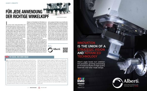 I rather the right solution at the right time. This is why Alberti has been working for years to provide and guarantee high-performance products along with a customer-oriented pre- and after-sale service. Starting from the analysis of each customer’ s needs Alberti method guarantees to provide the best technical solution for each application. Once the preliminary project has been approved and its compatibility checked by customer, Alberti can start the manufacturing of the components. Starting from over 250 models of angle heads available in the catalogue, most of the products can be customized thanks to a wide range of options. Custom-made design and higher flexibility of use of all Alberti heads have been a determining factor for the company’ s success. All Alberti heads can therefore be used for different operations such as milling, drilling and tapping and can be used in several sectors such as aerospace, automotive, energy and medical industries. In addition, the company based in Saronno offers an on-time customer support and maintenance services including the supply of original spare parts, online chat, tutorial videos and, in some cases, also on-site installation. Today, Alberti Umberto looks at the future and constantly invests in innovation with new products and production lines. The newly introduced NEO line was developed to improve and enhance the standard lineup. Specifically designed to satisfy new market needs for increased performances, torque capacity, speed and reliability, the NEO heads can include internal coolant supply with dry running possibility. As a completion to the product portfolio, Alberti has recently focused on the production of solutions for high speed machining in confided spaces. The new Ultraslim family highlights performances and torque in a very compact design to respond to the most challenging machining conditions in confined spaces. Here the play on words“ A ciascuno la sua testa” – to each his own head has become a slogan that fits perfectly for a company able to meet the individual needs of each customer in a concrete and flexible way. Come and visit us in our stand at EMO to see all the latest news.