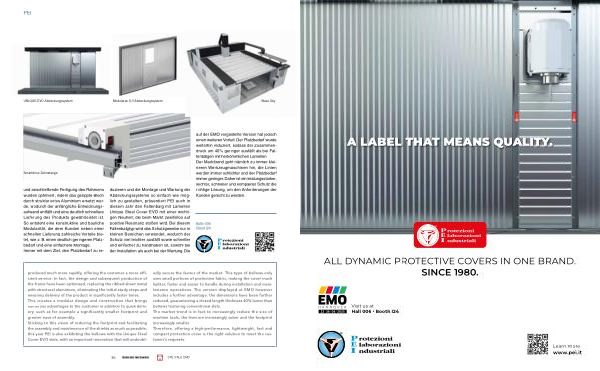 Halle 006 Stand I24 produced much more rapidly, offering the customer a more efficient service. In fact, the design and subsequent production of the frame have been optimised, replacing the ribbed sheet metal with structural aluminium, eliminating the initial study steps and ensuring delivery of the product in significantly faster times. This creates a modular design and construction that brings numerous advantages to the customer in addition to quick delivery, such as for example a significantly smaller footprint and greater ease of assembly. Sticking to this vision of reducing the footprint and facilitating the assembly and maintenance of the shields as much as possible, this year PEI is also exhibiting the bellows with the Unique Steel Cover EVO slats, with an important innovation that will undoubtedly secure the favour of the market. This type of bellows only uses small portions of protective fabric, making the cover much lighter, faster and easier to handle during installation and maintenance operations. The version displayed at EMO however includes a further advantage: the dimensions have been further reduced, guaranteeing a closed length thickness 40 % lower than bellows featuring conventional slats. The market trend is in fact to increasingly reduce the size of machine tools, the lines are increasingly sober and the footprint increasingly smaller. Therefore, offering a high-performance, lightweight, fast and compact protection cover is the right solution to meet the customer’ s requests.