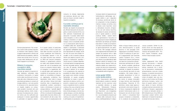 VDMA , l ’ associazione degli industriali tedeschi , sostiene le aziende nazionali nel loro percorso verso la neutralità climatica . La guida pratica “ Klimaneutral Produzieren – Handlungsempfehlungen für den Maschinen- und Anlagenbau ( Produzione climaticamente neutra - raccomandazioni d ’ azione per il settore delle costruzioni meccaniche e dell ’ impiantistica )” è disponibile in lingua tedesca presso gli uffici dell ’ associazione . La guida descrive in otto passaggi come raggiungere la neutralità climatica . Il punto di partenza di ogni azione è rappresentato dal Corporate Carbon Footprint ( CCF ), ovvero l ’ impronta di carbonio dell ’ azienda , che descrive la situazione attuale . Sulla base dell ’ impronta di carbonio , diventa possibile pianificare e adeguare le emissioni future investendo in impianti di produzione più efficienti dal punto di vista energetico . Allo stesso tempo , è possibile diversificare le fonti di approvvigionamento includendo anche le energie rinnovabili . A lungo termine , sarà importante documentare l ’ impronta di CO 2 dell ’ intera catena degli approvvigionamenti e del valore ( Scope 3 ). In futuro , il passaporto digitale dei prodotti memorizzerà tutte le informazioni sul ciclo di vita in modo che i clienti e i consumatori finali possano consultare e comprendere le condizioni di produzione di