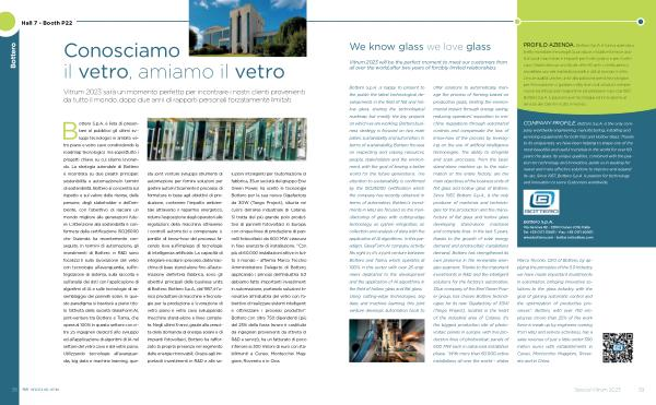 Bottero S . p . A . è lieta di presentare al pubblico gli ultimi sviluppi tecnologici in ambito vetro piano e vetro cavo condividendo la roadmap tecnologica ma soprattutto i progetti chiave su cui stiamo lavorando . La strategia aziendale di Bottero è incentrata su due pilastri principali : sostenibilità e automazione . In termini di sostenibilità , Bottero si concentra sul rispetto e sul valore delle risorse , delle persone , degli stakeholder e dell ’ ambiente , con l ’ obiettivo di lasciare un mondo migliore alle generazioni future . L ’ attenzione alla sostenibilità è confermata dalla certificazione ISO26000 che l ’ azienda ha recentemente conseguito . In termini di automazione , gli investimenti di Bottero in R & D sono focalizzati sulla lavorazione del vetro con tecnologie all ’ avanguardia , sull ’ integrazione di sistema , sulla raccolta e sull ’ analisi dei dati con l ’ applicazione di algoritmi di IA e sulle tecnologie di assemblaggio dei pannelli solari . In questo paradigma si inserisce a pieno titolo l ’ attività della società GlassForm . AI , joint-venture tra Bottero e Tiama , che opera al 100 % in questo settore con oltre 25 ingegneri dedicati allo sviluppo ed all ’ applicazione di algoritmi di IA nel settore del vetro cavo e del vetro piano . Utilizzando tecnologie all ’ avanguardia , big data e machine learning , que- sta joint venture sviluppa strumenti di automazione per fornire soluzioni per gestire automaticamente il processo di formatura in base agli obiettivi di produzione , contenere l ’ impatto ambientale attraverso il risparmio energetico , ridurre l ’ esposizione degli operatori alle regolazioni della macchina attraverso i controlli automatici e compensare la perdita di know-how del processo facendo leva sull ’ impiego di tecnologie di intelligenza artificiale . La capacità di integrare e scalare i processi , dalla macchina di base stand-alone fino all ’ automazione dell ’ intera fabbrica , sono gli obiettivi principali delle business units di Bottero . Bottero S . p . A ., dal 1957 , è l ’ u- nico produttore di macchine e tecnologie per la produzione e lavorazione di vetro piano e vetro cavo sviluppando macchine stand-alone e linee complete . Negli ultimi 5-anni , grazie alla crescita della domanda di energia solare e di impianti fotovoltaici , Bottero ha rafforzato la propria presenza nel segmento delle energie rinnovabili . Grazie agli importanti investimenti in R & D e alle so-