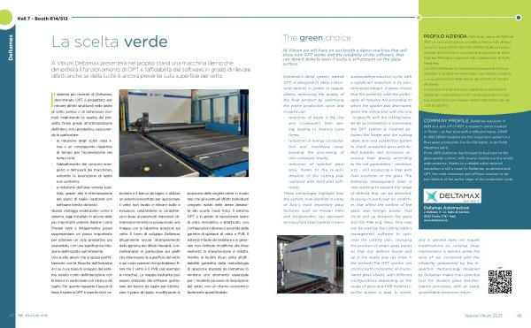 - reduction of rejected glass area , thanks to the re-optimisation of the cutting plan ( optional with third part software ). These advantages highlight how the system , now installed in some of Italy ’ s most important glass factories such as Predari Vetri and Artigianvetro , can represent an important step towards a more sustainable production cycle , with a significant reduction in its environmental impact . A green choice that fits perfectly with the philosophy of Industry 4.0 according to which the system was developed , given the interaction with the line - in specific with the cutting table . As far as installation is concerned , the OPT system is inserted between the loader and the cutting table , and uses a patented system to check unwashed glass and detect bubbles and inclusions , assessing their gravity according to the set parameters - minimum size - and producing a map with their positions on the glass . The Deltamax development team is now working to expand the range of defects that can be detected , focusing in particular on scratches that affect the surface of the glass and foreign bodies that could end up between the glass and the PVB ( e . g . flies ). This map can be used by the cutting table ’ s management software to optimise the cutting plan , changing the position of single glass panes so that any defects found end up in the waste area ( as show in the picture ). The OPT system can control both monolithic and laminated glass sheets , with different configurations depending on the range of glass and PVB thicknesses . The system is easy to install ,