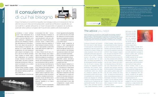 Glass Company is synonymous with quality , technology , research and innovation that goes beyond standard mechanical solutions . Based in Pesaro , this enterprise is above all a consultant with a team of specialists and engineers able to help customers in the selection and development of machines capable of meeting their real needs .