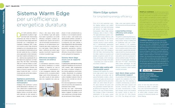 Dal 5 all ’ 8 settembre 2023 , il produttore di adesivi e sigillanti H . B . Fuller | Kömmerling presenterà alla Vitrum di Milano la sua soluzione Warm Edge altamente funzionale con il distanziatore termoplastico Ködispace 4SG . Il sistema vincente riunisce l ’ alta efficienza energetica con la straordinaria durata . La produzione robotizzata precisa dei vetri isolanti dà vita a un ’ estetica unica , apprezzata a livello internazionale nelle moderne architetture in vetro – dalle facciate ai grattacieli , fino ai tetti dalle forme organiche . Con Ködispace 4SG , H . B . Fuller | Kömmerling offre per il mercato italiano un sistema innovativo e riconosciuto a livello mondiale per finestre e facciate , che riduce al minimo la perdita di calore lungo il bordo del vetro – e lo fa in modo durevole , anche nelle condizioni climatiche più severe .