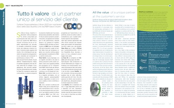 Surfaces Group , massimo riferimento nella produzione di utensili consumabili per la lavorazione del vetro , sarà a Vitrum con i brand Adi , RBM Italia e Vincent . Un ’ unione che ha un impatto esponenziale sul mercato , le variegate competenze interagiscono , per elaborare soluzioni , tarate in funzione delle esigenze del cliente , che si distinguono per garantire le risposte tecnologicamente più avanzate , per accrescere le performance e ridurre i TCO . Non solo per fornire utensili , ma per definire l ’ implementazione ideale , la perfetta regolazione dei macchinari . Dalla fase di sviluppo e progettazione , alla concreta operatività fino all ’ assistenza post vendita , la Glass BU si propone sempre più come partner , in grado di proporre la soluzione migliore per il successo del processo produttivo del cliente . A Vitrum saranno presenti i prodotti di punta , una garanzia di risultato per le alte performance , l ’ elevata durata e la costanza di risultato . L ’ edizione 2023 coincide con l ’ anniversario di RBM Italia che festeggia i 60 anni di attività . Leader nel settore delle mole per lucidatura , registra una crescita continua grazie agli importanti investimenti in R & D . Le ultime novità sono : Mola Switch , nuova tipologia con un legante innovativo , da usare in ultima posizione prima delle lucidanti . Lascia una rugosità perfetta per proseguire con le “ classiche ” mole RBM . Molto facile da utilizzare e settare . Disponibile a corona continua o con 16 intagli da 2 mm . Mola CX8 , nuovissima mola al cerio a legante semirigido , con un ottimo rapporto prezzo / qualità / durata . Disponibile in tutte le misure e adatta a tutte le rettilinee e bilaterali . Adi , vera e propria eccellenza del Made in Italy , per la capacità di gestire internamente tutto il processo di sinterizzazione dei suoi utensili , in vari leganti , porterà a Vitrum la gamma UHS ®, per CNC orizzontali e verticali . Inizialmente progettata per l ’ automotive , è ora preferita , anche nei settori solare e architettonico , per i risultati nettamente superiori allo standard . Oltre agli untensili diamantati , Adi offre anche soluzioni per riparare lastre già montate che presentano macchie o graffi . Due i set prodotti , Glass Renu per il vetro e PXCare per il polimetilmetacrilato . Con la loro flessibilità d ’ uso , lavorano a secco e in loco , evitando lo smontaggio della lastra . La Glass BU si completa con Vincent , parte del gruppo dal 2021 . Specializzata nella produzione di utensili diamantati per il taglio e la molatura , sta rivoluzionando i processi di lavorazione del vetro piano su molatrici bilaterali introducendo il set di mole a tazza Starflex . Un set universale , che può processare qualsiasi tipo di vetro , dall ’ ultrasottile specchio di 3 mm ., fino allo spessore di 30mm , dal monolitico allo stratificato , utilizzando sempre la stessa sequenza di utensili . Il set Starflex oltre al diametro 175 mm ., è oggi disponibile anche con il diametro 150 mm . Garantisce un ’ eccellente capacità di rimozione ad alte velocità , può essere montato su tutte le macchine sia rettilinee che bilaterali .