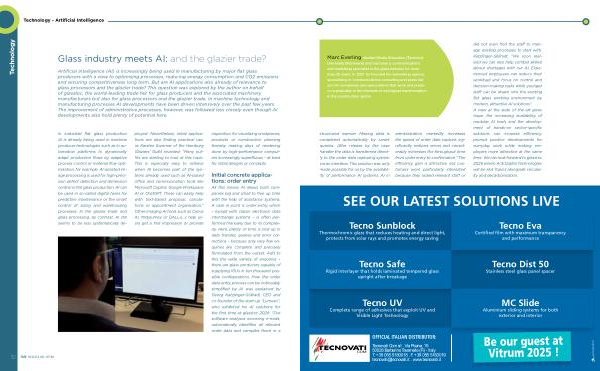 In industrial flat glass production AI is already being used in machine producer technologies such as in automation platforms to dynamically adapt production flows by adaptive process control or material flow optimisation, for example. AI-assisted image processing is used for high-precision defect detection and dimension control in flat glass production. AI can be used in so-called digital twins for predictive maintenance or the smart control of sizing and warehousing processes. In the glazier trade and glass processing, by contrast, AI still seems to be less systematically de- ployed. Nevertheless, initial applications are also finding practical use, as Karsten Sommer of the Hamburg Glaziers’ Guild revealed:“ Many outfits are starting to look at this topic. This is especially easy to achieve when AI becomes part of the systems already used such as AI-based office and communication tools like Microsoft Copilot, Google Workspace AI or ChatGPT. These can easily help with text-based proposal, calculations or appointment organisation.” Other imaging AI tools such as Canva AI, Midjourney or DALL · E 3 help users get a first impression or provide inspiration for visualising workpieces, products or construction planning thereby making days of rendering done by high-performance computers increasingly superfluous – at least for initial designs or concepts.