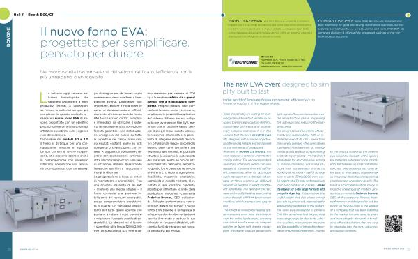to the precise control of the thermal curves and the flexibility of the system, the material’ s potential can be exploited to the full even on small customized batches.“ We designed this oven on the basis of what glass companies ask us every day: flexibility, energy saving, simplicity and consistent quality. The result is a concrete solution, ready to face the challenges of modern production,’ comments Federica Bovone, CEO of the company. Robust, highperformance and designed to last, the new EVA Bovone oven is the answer of a company that has been listening to the market for over seventy years and translating its demands into reliable, efficient solutions that are easy to integrate into the most advanced production contexts.