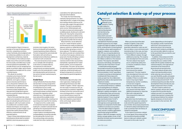 The ideal catalyst will give you a robust and reproducible process while reducing costs and waste. If you want flexibility, quality and speed, look to the development partnership of Sinocompound and InCatT. Their combined expertise provides shorter development times and reduces your target compound’ s time to market. You don’ t need to settle for an inferior catalyst, and you don’ t need to spend the time producing the catalyst yourself. Let a specialised catalyst development company like Sinocompound deliver the catalyst, ligands and peace of mind to drive your product to the next level. ●