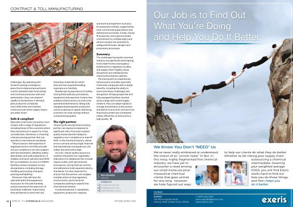 our small molecule pharmaceutical chemical clients that goes unmet clients that goes unmet for very long. However, for very long However we have figured out ways we have figured out ways to help our clients do what they do better. to help our clients do what they do better Whether its de-risking your supply chain, Whether its de-risking your supply chain outsourcing a chemical outsourcing chemical intermediate, lowering intermediate lowering your weighted average your weighted average COGS, you will find Exeris COGS you will find Exeris works hard to find out works hard to find out how you do those things, how you do those things and then helps you and then helps you do it better. do it better