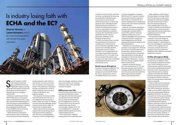 REGULATION & COMPLIANCE contentious from the start, with other countries, including the UK, favouring the original Not Classified status. It was based on animal studies showing lung tumours in rats at high exposure levels, although the data demonstrating any correlation in humans has not proved conclusive. As TiO 2 is used widely in industry, from paints to plastics, cosmetics and more, the classification caused significant concern. Industry decided to challenge it in the European General Court.