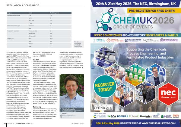 Ukrainian chemical legislation closely mirrors EU REACH and CLP, with key deviations primarily related to the absence of a robust IT infrastructure and ongoing regulatory ambiguities. The key recommendation is to complete pre-registration as soon as possible to secure the associated grace period. As a second step it is necessary to identify potential co-registrants after the preregistration. It is also essential to monitor developments in Ukraine, as regulatory timelines and digital tools may evolve in the coming months. ●