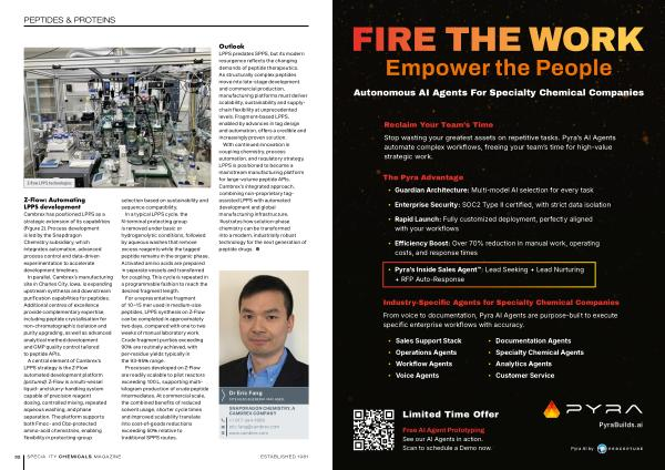 With continued innovation in coupling chemistry, process automation, and regulatory strategy, LPPS is positioned to become a mainstream manufacturing platform for large-volume peptide APIs. Cambrex’ s integrated approach, combining non-proprietary tagassisted LPPS with automated development and global manufacturing infrastructure, illustrates how solution-phase chemistry can be transformed into a modern, industrially robust technology for the next generation of peptide drugs. ●