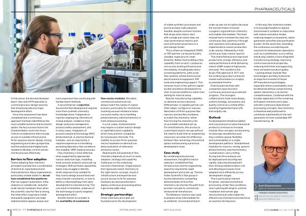 Once this assessment has been completed and a continuous approach has been identified as the most suitable technical and economic option, the key success factors for implementation come into focus. Critical considerations then include access to suitable infrastructure, fit-for-purpose reactor design, strong engineering and scale-up expertise, and the analytical and digital tools needed to develop, control and derisk the process effectively.