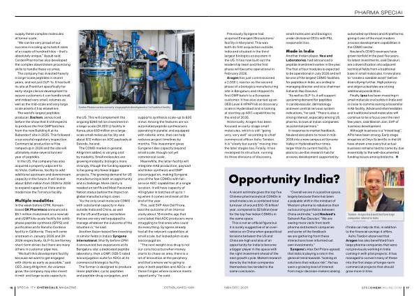 Meanwhile, the latter facility will integrate mAb production, payload and linker synthesis and GMP bioconjugation, making Syngene one of the few CDMOs with fullservice ADC capabilities at a single location. It will have capacity of 40 kg / year in batches of up to 1 kg when it comes onstream at the end of the year.