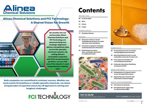 Six months into our partnership, Alinea Chemical Solutions and FCI Technology are demonstrating how strategic alignment delivers exceptional value across the specialty chemicals industry. By uniting Alinea ' s formulation expertise with FCI ' s broad chemical portfolio, we now offer one of the industry’ s most comprehensive solution sets.