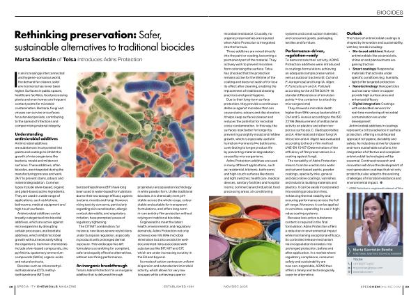 The versatility of Adins Protection means it can be used across water and solvent-based paints, powder coatings, speciality inks, general and decorative coatings, varnishes and industrial building materials and plastics. It can be easily incorporated into existing production lines, enhancing thermal stability and ensuring performance across the full pH range. Moreover, it can be applied in varnishes, expanding its use in highvalue coating systems.