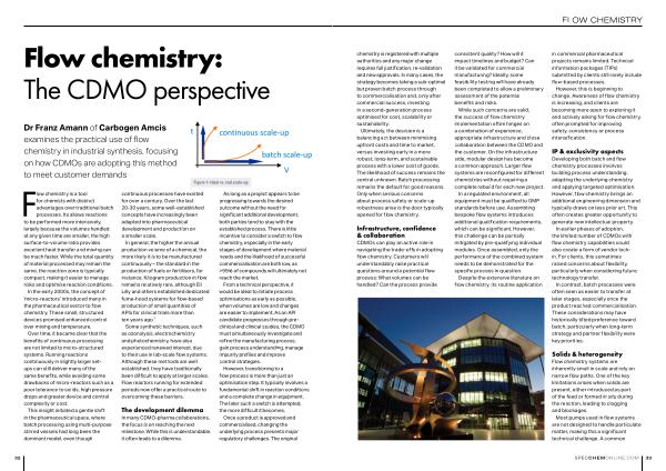FLOW CHEMISTRY chemistry is registered with multiple authorities and any major change requires full justification, re-validation and new approvals. In many cases, the strategy becomes taking a sub-optimal but proven batch process through to commercialisation and, only after commercial success, investing in a second-generation process optimised for cost, scalability or sustainability.