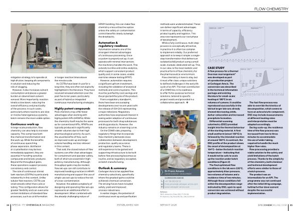 That said, the closed nature of flow systems can offer clear advantages for containment and operator safety, both of which are essential in highpotency manufacturing. Although throughput gains may be modest, flow set-ups can still contribute to improved handling practices in HPAPI manufacturing and support the use of single-use set-ups to reduce the risk of cross-contamination.