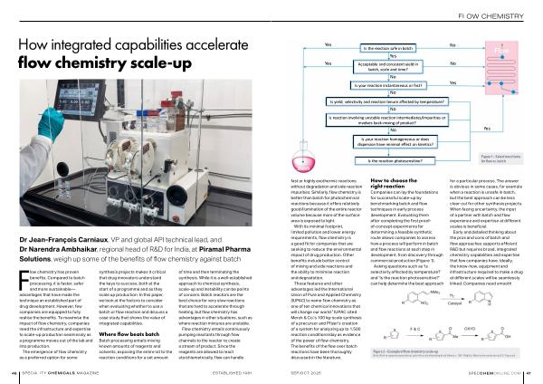 Early and detailed thinking about the pros and cons of batch and flow approaches supports efficient R & D but requires broad, integrated chemistry capabilities and expertise that few companies have. Ideally, the know-how, equipment and infrastructure required to make a drug at different scales will be seamlessly linked. Companies need smooth