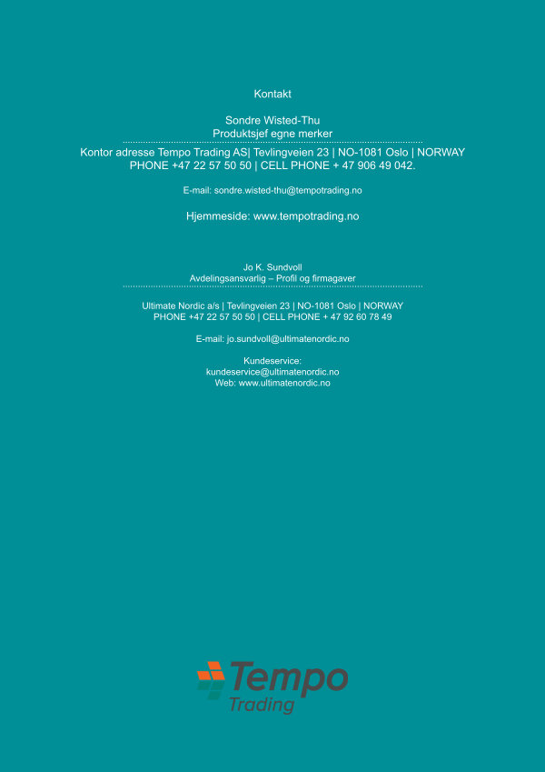 Sondre Wisted-Thu Produktsjef egne merker...................................................................................................................... Kontor adresse Tempo Trading AS | Tevlingveien 23 | NO-1081 Oslo | NORWAY PHONE + 47 22 57 50 50 | CELL PHONE + 47 906 49 042.