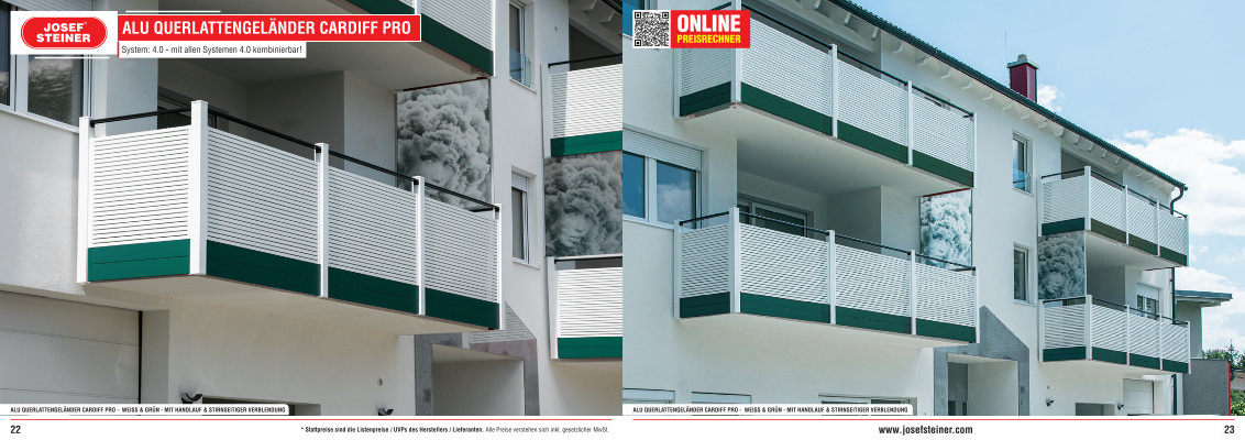 ALU QUERLATTENGELÄNDER CARDIFF PRO - WEISS & GRÜN - MIT HANDLAUF & STIRNSEITIGER VERBLENDUNG