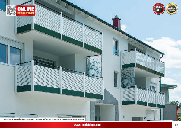 ALU QUERLATTENGELÄNDER CARDIFF PRO- WEISS & GRÜN- MIT HANDLAUF & STIRNSEITIGER VERBLENDUNG