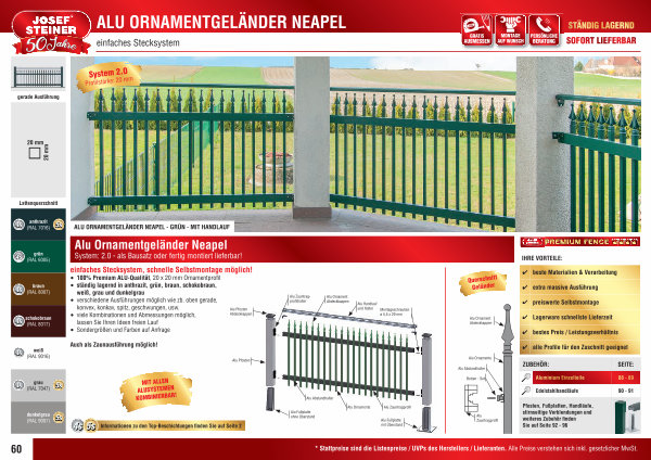 Pfosten, Fußplatten, Handläufe, stirnseitige Verblendungen und weiteres Zubehör finden Sie auf Seite 92- 96