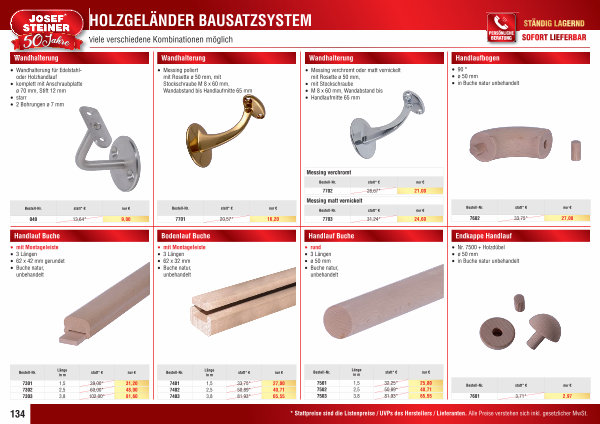 • Messing poliert mit Rosette ø 50 mm, mit Stockschraube M 8 x 60 mm, Wandabstand bis Handlaufmitte 65 mm |