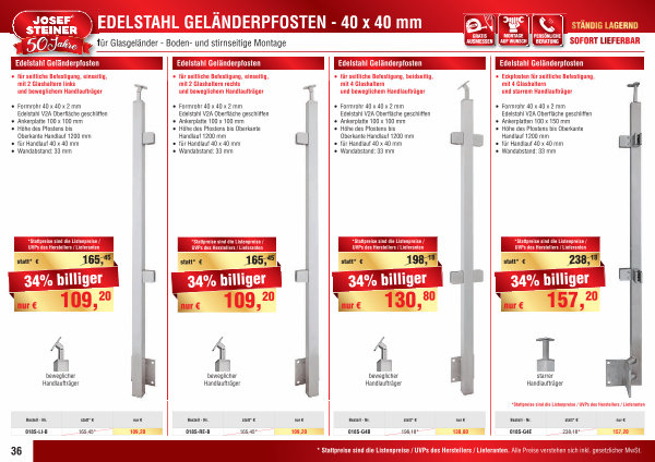 EDELSTAHL GELÄNDERPFOSTEN- 40 x 40 mm für Glasgeländer- Boden- und stirnseitige Montage