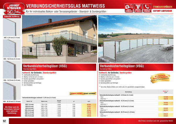 VERBUNDSICHERHEITSGLAS MATTWEISS für Ihr individuelles Balkon- oder Terrassengeländer- Standard- & Sondergrößen
