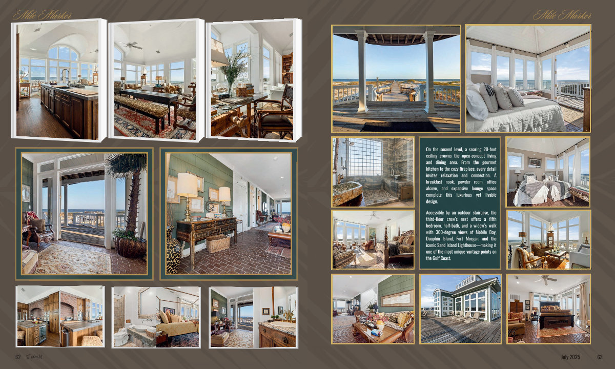 Accessible by an outdoor staircase, the third-floor crow’ s nest offers a fifth bedroom, half-bath, and a widow’ s walk with 360-degree views of Mobile Bay, Dauphin Island, Fort Morgan, and the iconic Sand Island Lighthouse— making it one of the most unique vantage points on the Gulf Coast.