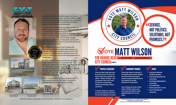 Paid for by friends of Matt Wilson LLC for Orange Beach City Council Place 2 27304 Marina Road, Orange Beach Al 36561“ Advertisement paid for by the candidate. Splash The Magazine does not endorse any candidate for public office.”