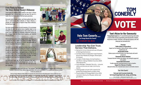 With the Gulf breeze gently rustling through the pines, Tom Young stood to address the crowd on behalf of his parents and siblings. His voice filled with emotion, Tom expressed the family’ s deep appreciation for the city’ s recognition of their parents’ legacy.