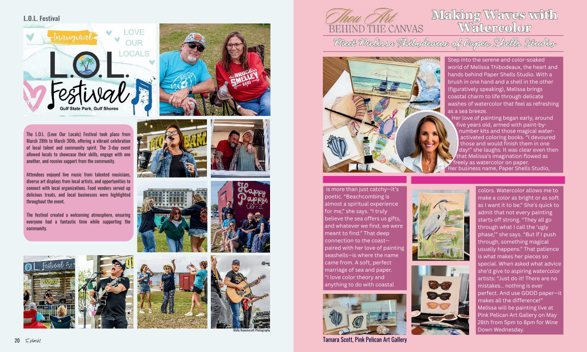 Step into the serene and color-soaked world of Melissa Thibodeaux, the heart and hands behind Paper Shells Studio. With a brush in one hand and a shell in the other( figuratively speaking), Melissa brings coastal charm to life through delicate washes of watercolor that feel as refreshing as a sea breeze. Her love of painting began early, around five years old, armed with paint-bynumber kits and those magical wateractivated coloring books.“ I devoured those and would finish them in one day!” she laughs. It was clear even then that Melissa’ s imagination flowed as freely as watercolor on paper.