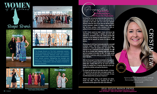 What sets Crystal apart is her deep commitment to the people she serves. Every deal is guided by integrity, professionalism, and the Golden Rule— treating clients the way she would want to be treated. As a boutique firm, C Properties allows her to give each client the time, attention, and expertise they deserve. For Crystal, the Gulf Coast isn’ t just where she works— it’ s home.“ I’ m blessed to live and work where most people vacation,” she says.“ The sunsets, the water, the sense of community— it’ s easy to sell the beauty of this area, because I truly love it.”