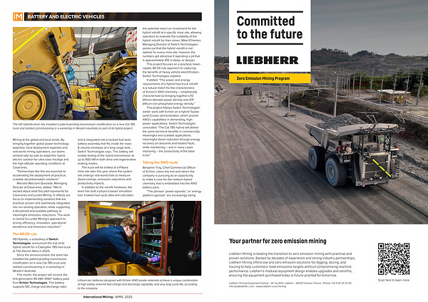Liebherr Mining is leading the transition to zero emission mining with practical and proven solutions. Backed by decades of experience and strong industry partnerships, Liebherr Mining offers low and zero emission solutions for digging, dozing, and hauling to help customers meet emissions targets without compromising machine performance. Liebherr’ s modular equipment design enables upgrades and retrofits, ensuring the equipment purchased today is future-proofed for tomorrow.